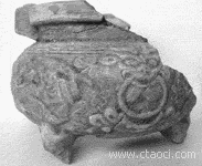 宋代磁州窯孔雀綠釉三足爐,陶胎磚紅色,仿商周雙立耳青銅鼎造型,又有創(chuàng)新改良。爐腹周身模印兩組童子荷蓮圖和兩個(gè)獸面銜環(huán)鋪首。上施雅麗清翠孔雀綠釉,有剝釉現(xiàn)象。