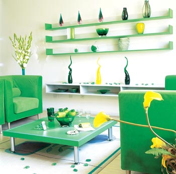 綠色調(diào)的擱板,上邊同樣擺設(shè)了綠色玻璃器皿裝飾,讓家更顯清爽明快。