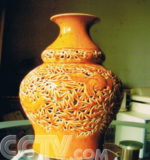 嘉賓:這是一種黃釉的,另外又是雕刻的鏤刻的,花鳥紋的一個瓶,黃釉鏤刻花鳥紋的一個瓶。這種造型怪怪的。