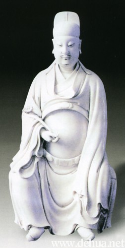 文昌頭戴唐巾,兩巾腳縛于后分垂頸肩,國(guó)字臉龐,丹鳳眼,大耳,嘴角留裂縫以填充須髯。文昌右手執(zhí)如意,左手自然下垂,兩足登靴微露。胎白堅(jiān)實(shí)厚重,釉呈乳白色,細(xì)膩瑩潤(rùn)。整尊塑像顯得雍容大度,衣袂圓潤(rùn),富有層次變化,背部鈐有“何朝宗印”方形印章。