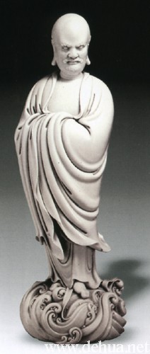 達(dá)摩容貌威嚴(yán),身材偉岸,雙手?jǐn)n袖于胸前,赤足立于波濤之上,取材于達(dá)摩一葦渡江故事。此尊塑像胎體厚重,潔白堅(jiān)實(shí),通體施象牙白釉,釉面純凈瑩潤(rùn),背部鈐有“何朝宗印”方形印章款。