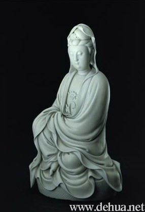 觀音盤膝而坐,面容慈祥,溫良嫻雅,帶有明顯的男子氣質(zhì);其衣紋線條柔潤(rùn)流暢,頭部、酥胸、手腳等細(xì)部刻劃細(xì)膩,整尊塑像以象牙白為瓷質(zhì),將觀音善良、正直、莊嚴(yán)的神態(tài)表現(xiàn)得惟妙惟肖。背部鈐有“何朝宗”葫蘆形印章款。