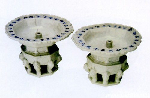 白釉泛青燭臺(對),道光十年(1830年),高16.5厘米,口徑2.5厘米,釉水白中微泛青,折沿口青花銘有“董坂宮章公相公爐前弟子黃允欽叩謝道光拾年仲冬吉日造立”等字樣。
