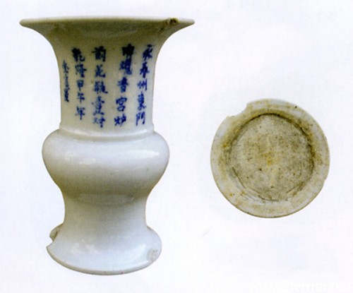 白釉泛青鳳尾尊,乾隆甲午年(1774年),高18.5厘米,口徑13厘米,瓶圓口外撇,底內(nèi)凹圈足,白釉,微泛青色,器壁青花銘有“永春州東門內(nèi)觀音宮爐前花瓶壹對(duì)乾隆甲午年季長(zhǎng)置’等字樣。