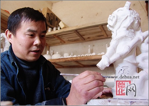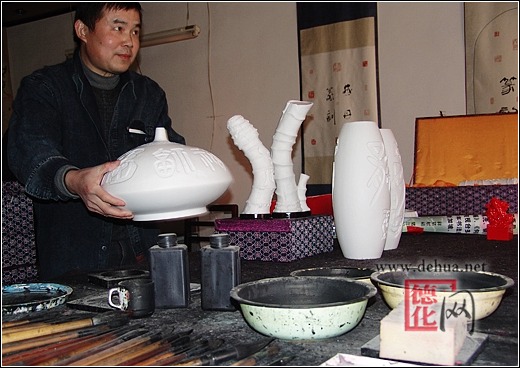 何燕丹來自江西九江,幼時(shí)即癡迷書法藝術(shù),其篆隸書體達(dá)到形神、動(dòng)靜、虛實(shí)的和諧統(tǒng)一,作品先后在全國(guó)、省、市大賽中多次獲獎(jiǎng)。自1993年結(jié)緣德化后,他就開始嘗試以刀代筆,運(yùn)用傳統(tǒng)金石刀法,將篆刻、書畫藝術(shù)、陶瓷工藝融合為一體,先后開發(fā)出陶瓷印、瓷刻等系列瓷種。此次開發(fā)出立體書法瓷雕《舞》、《中國(guó)第一“龍”》、《福“豬”賀新》、《福》、《祿》、《壽》、《禧》等作品,生動(dòng)形象、氣韻流暢,具有較高的藝術(shù)價(jià)值和欣賞價(jià)值。