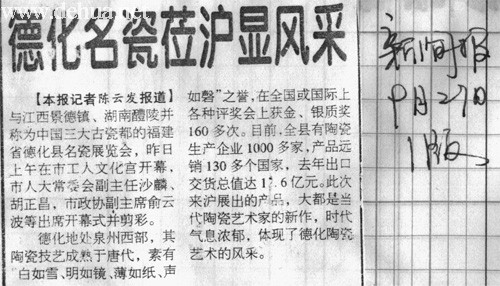 德化地處泉州西部,其陶瓷技藝成熟于唐代,素有“白如雪、明如鏡、薄如紙、聲如磬”之譽,在全國或國際上各種評獎會上獲金、銀質(zhì)獎160多次。目前,全縣有陶瓷生產(chǎn)企業(yè)1000多家,產(chǎn)品遠銷130多個國家,去年出口交貨總值達12.6億元。此次來滬展出的產(chǎn)品,大都是當(dāng)代陶瓷藝術(shù)家的新作,時代氣息濃郁,體現(xiàn)了德化陶瓷藝術(shù)的風(fēng)采。