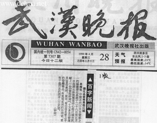 本報(bào)訊中國(guó)古代大古瓷都之一的德化縣將于二十八日至五月一日在湖北體育展覽中心給江城市民獻(xiàn)上一臺(tái)瓷支好戲,十萬多名瓷演員登臺(tái)亮相。其中,有出自名家之手的瓷雕精品,有美觀實(shí)用的日用瓷,更有千姿進(jìn)態(tài)的西洋小工藝瓷。(鐘瓊)