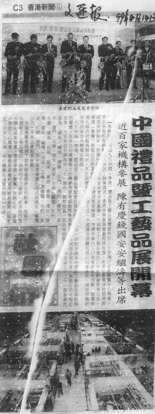 九九中國(guó)(香港)禮品暨工藝品展覽會(huì)自發(fā)開拓以來,得到全國(guó)各地禮品工藝品企業(yè)的熱烈響應(yīng)。很多公司懷著極大的興趣來電來函詢問參展事宜,并辦理參展手續(xù),參展公司共有近百家,分別來自全國(guó)各地三十一個(gè)市、縣和地區(qū),展品種類繁多,琳瑯滿目。三十一個(gè)參展地區(qū)為:廣州、潮州、潮陽(yáng)、江門、深圳、福州、泉州、廈門、永春、南安、惠安、安溪、德化、杭州、永康、龍泉、臺(tái)州、慈溪、寧波、青島、煙臺(tái)、香港、臺(tái)灣、澳門。其中福建省德化縣共組織五十個(gè)展位六十多家企業(yè)前來參展。