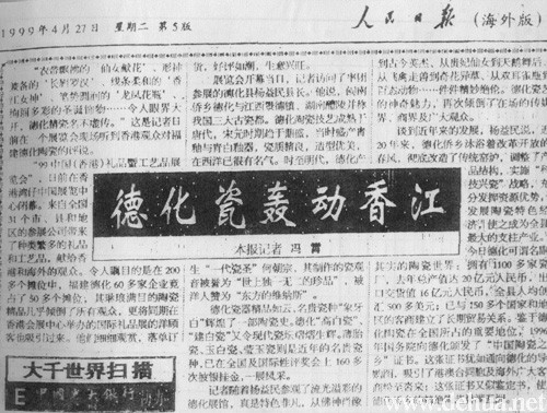 “99中國(guó)(香港)禮品暨工藝品展覽會(huì)”,日前在香港灣仔中國(guó)展覽中心閉幕。來(lái)自全國(guó)31個(gè)市、縣和地區(qū)參展公司帶來(lái)了種類繁多的禮品和工藝品,獻(xiàn)給香港和海外的觀眾。令人矚目的是在200多個(gè)攤位中,福建德化60多家企業(yè)竟占了50多個(gè)攤位,其琳瑯滿目的陶瓷精品幾乎傾倒了所有觀眾,更將同期在香港會(huì)展中心舉辦的國(guó)際禮品展的洋顧客也吸引過(guò)來(lái)。他們細(xì)細(xì)觀賞,落單訂貨。好評(píng)如潮,生意興旺。