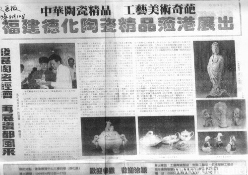 ’99中國(guó)(香港)禮品暨工藝品展覽會(huì)即將開(kāi)幕,中國(guó)陶瓷之鄉(xiāng)——福建省德化縣有幸組團(tuán)參加這個(gè)展覽會(huì),借此機(jī)會(huì),我們向香港及海內(nèi)外各界人士致意,歡迎大家屆時(shí)參觀(guān)德化館。
