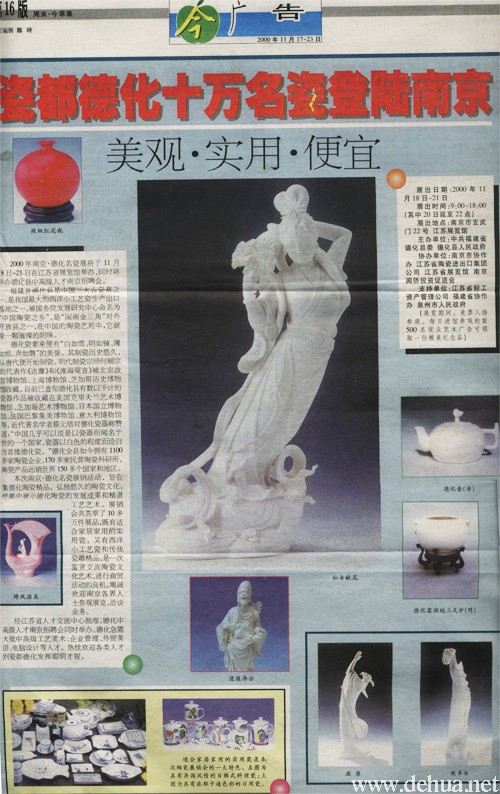 2000年南京·德化名瓷展將于11月18日-21曰在江蘇省展覽館舉辦,同時(shí)將舉辦德化縣中高級人才南京招聘會(huì)。