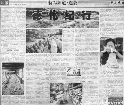 令人感觸很深的是:德化雖是一個(gè)不大的地方,但卻是一個(gè)歌舞升平,安居樂(lè)業(yè)的好地方,一個(gè)時(shí)期以來(lái),周邊一些地區(qū)流行六合彩,不少人深陷其中,而德化人卻忙著上班,忙著靠勞動(dòng)掙錢(qián),他們相信靠勞動(dòng)掙錢(qián)是最可靠的了,而這個(gè)可靠的大門(mén)就向他們開(kāi)著。傍晚記者留連于這個(gè)繁華的縣城,城中被稱為母親河的浐溪河倒映著兩岸霓虹閃爍的商店以及消閑購(gòu)物的人們,水波擺動(dòng)把兩岸的幸福抖動(dòng)得流光溢彩,這景象給我們的啟迪太深了:是瓷讓德化這樣美的。