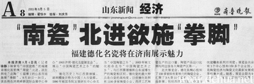 本報濟南9月4日訊(記者徐 靜) 被譽為“中國瓷都”的福建省德化縣要攜“南瓷”北進,欲在擁有“北陶”(淄博)的山東市場施展“拳腳”。9月10日-14日,該縣將在濟南舜耕國際會展中心舉辦“2003濟南·德化名瓷展覽會”,展示“中國陶瓷藝術(shù)之鄉(xiāng)”的魅力。
