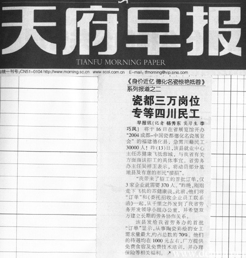 會”的福建德化縣,急需川籍民工30000人!昨(13)日,該縣就業(yè)中心主任蘇健康飛抵蓉城,與我省有關(guān)方面商談?wù)泄さ木唧w事宜。省勞務(wù)辦主任吳祥玉表示,將動員部分基地縣及有意的市民“接招”。