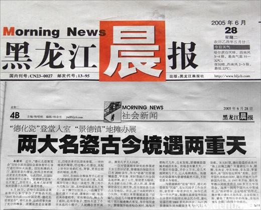 “德化名瓷展覽會”在哈爾濱市國際會展體育中心B廳進行得如火如荼,國際標(biāo)準(zhǔn)的大廳,富麗堂皇的擺設(shè),使得這里的展品更顯名貴高雅。與此同時,在國際會展體育中心室外,“景德鎮(zhèn)瓷器展”也開展了,烈日當(dāng)頭,地攤式隨意擺放的瓷器少人問津,備受冷落。