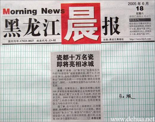 以“象牙白”瓷器聞名中外的“中國瓷都”福建省德化縣,將于6月24日至28日,在哈爾濱國際會展體育中心B廳舉辦“2005哈爾濱--中國瓷都德化名瓷展覽會”。屆時,一大批精美瓷器作品與冰城人們見面。