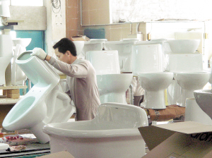 在“安華”,采訪團走進車間,零距離體驗了制作衛(wèi)浴產(chǎn)品的全過程。工人制坯的地方,迎面而來的是一種熱氣騰騰的感覺,由于樓下就是燒制車間,使得整個樓上很是悶熱。記者在采訪的幾十分鐘內(nèi)便熱得大汗淋漓,可一直來往工作著的工人們卻絲毫沒有懈怠之感,除了不時用毛巾擦擦額頭上的汗珠,便是盯著手邊的半成品不斷檢查。雖然有了現(xiàn)代化的灌模技術(shù),但是很多細節(jié)仍然需要技術(shù)工人逐一把關(guān),用他們自己的話說就是“不能放過任何一個瑕疵”。