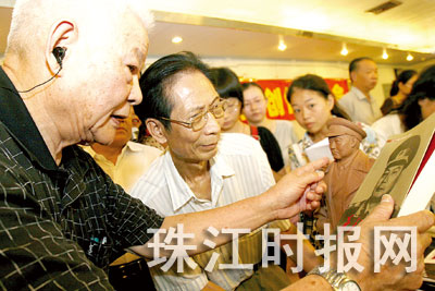 葉選平(左一)站在先父陶塑前,非常認(rèn)真地拿著《葉劍英傳記》的封面進(jìn)行對(duì)照。昨日上午,新石灣美術(shù)陶瓷廠(chǎng)舉行了石灣五位陶藝大師《十大元帥》陶塑創(chuàng)作研討會(huì),廣東省前省長(zhǎng)、葉劍英元帥之子葉選平對(duì)各元帥陶塑一一進(jìn)行了點(diǎn)評(píng)。