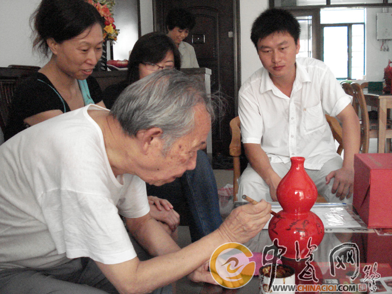 8月3日,中國(guó)工藝美術(shù)大師王錫良在《和諧中華迎奧運(yùn)》禮品中國(guó)紅葫蘆“福祿平”上簽名。 據(jù)景德鎮(zhèn)美術(shù)館工作人員介紹,江西省工藝美術(shù)大師王采、許國(guó)勝教授等一批藝術(shù)家于今天上午在奧運(yùn)禮品上簽名。 目前,奧運(yùn)會(huì)禮品已經(jīng)完成38件。其中中青年藝術(shù)家徐會(huì)全、張玲玲等將在晚會(huì)上捐贈(zèng)自己的陶瓷美術(shù)作品。