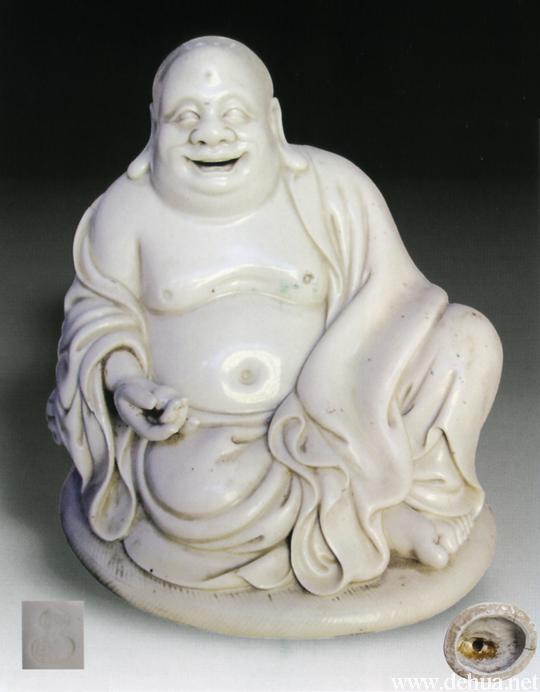 彌勒笑容可掬,雙目炯然有神,右手托珠,盤(pán)坐于蒲團(tuán)之上,寬袍長(zhǎng)袖,衣袂圓潤(rùn),背鈐有“何朝宗”葫蘆印。釉水溫潤(rùn),造型形象生動(dòng),令人嘆為觀止。