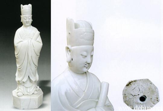 釉色白中閃黃,呈象牙色,溫潤細(xì)膩。文官頭戴官帽,丹鳳眼,鬢須以真毛填補(bǔ),雙手合攏于衣袖內(nèi),作執(zhí)笏板狀,神態(tài)閑然自若,立于臺上,精雕細(xì)刻,線條圓潤、流暢、洗練。底部僅留一小洞,系以整塊瓷泥捏塑而成,胎體渾厚,有窯裂。