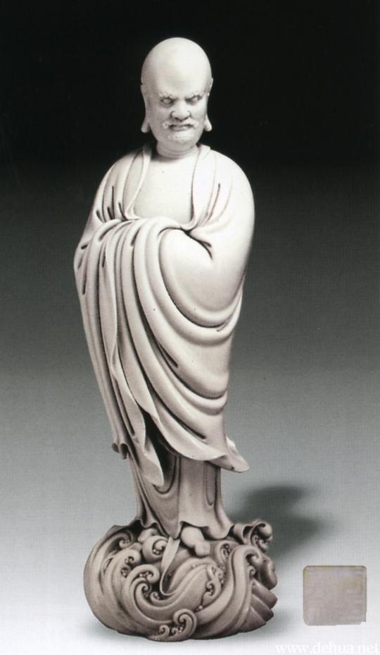 達(dá)摩容貌威嚴(yán),身材偉岸,雙手?jǐn)n袖于胸前,赤足立于波濤之上,取材于達(dá)摩一葦渡江故事。此尊塑像胎體厚重,潔白堅(jiān)實(shí),通體施象牙白釉,釉面純凈瑩潤,背部鈐有“何朝宗印”方形印章款。