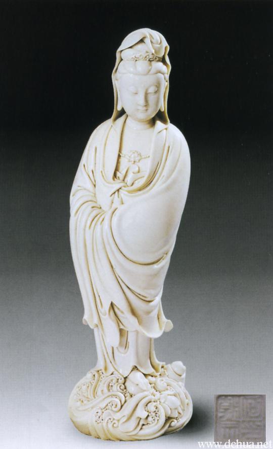 釉色白中泛黃,呈牙白色,如凝脂凍玉,滋潤(rùn)瑩滑。觀音雙手藏袖,露一足踏蓮花,另一足水花掩蓋,作踏浪凌波渡海之勢(shì)。觀音神情嫻雅平靜,安詳自若,雙目低垂凝思。整座塑像精巧細(xì)致,神態(tài)如生,背鈐有“何朝宗印”方形印章款。