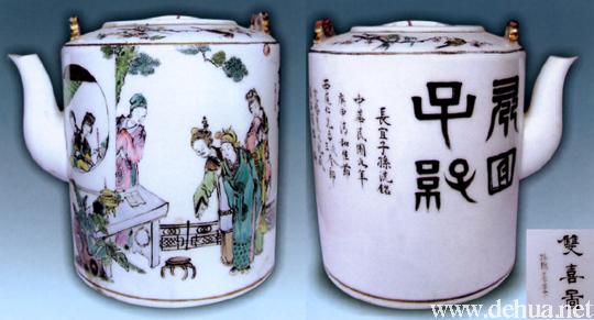 ▲民國九年(1920年) 五彩“雙喜圖”茶壺 高14.5厘米,口徑14.5厘米