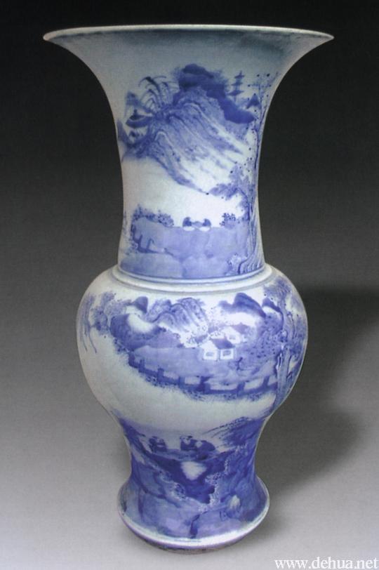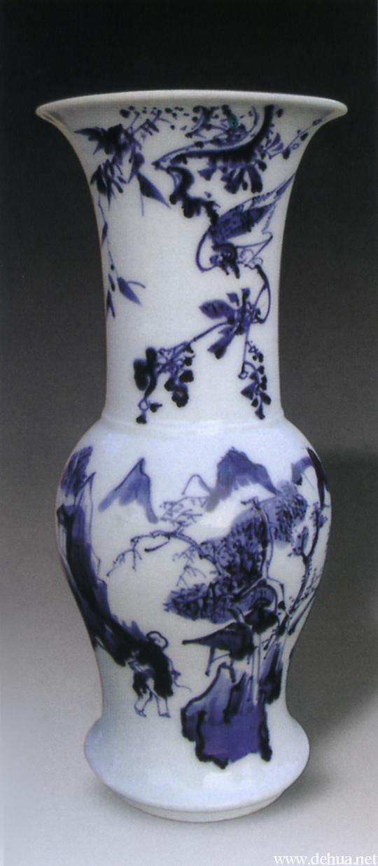賞析:童子肩扛芭蕉葉,舉目遠望,頗有“山外青山”之意境,瓶口飾有喜鵲登枝紋,畫風率意,瓶體飽滿,釉色滋潤,不愧為德化窯青花瓷之精品。