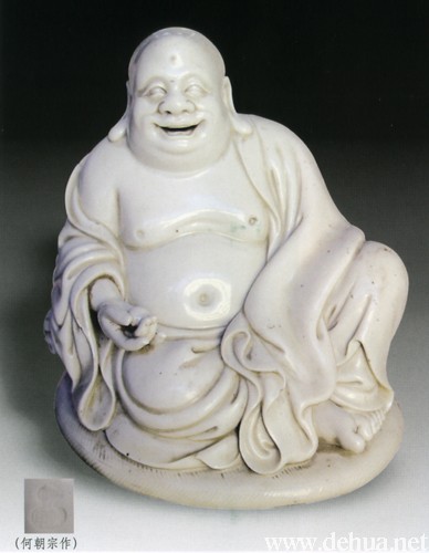 彌勒笑容可掬,雙目炯然有神,右手托珠,盤(pán)坐于蒲團(tuán)之上,寬袍長(zhǎng)袖,衣袂圓潤(rùn),背鈐有“何朝宗”葫蘆印。釉水溫潤(rùn),造型形象生動(dòng),令人嘆為觀止。