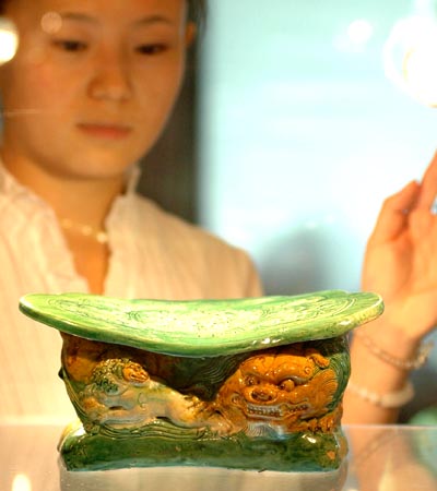 8月3日,“盛夏華章精品拍賣(mài)會(huì)”拍品預(yù)展于北京亞洲大酒店舉行,據(jù)主辦方介紹,本次預(yù)展品分千年古瓷枕、明清瓷器、佛教藝術(shù)品、名品紫砂壺與陳年普洱茶等專(zhuān)場(chǎng)。其中“千年夢(mèng)華──古瓷枕”專(zhuān)場(chǎng)最為搶眼,展出中的唐、宋、金時(shí)期陶瓷枕,不少是從海外征集而來(lái),具有極高的藝術(shù)價(jià)值和商業(yè)價(jià)值。據(jù)悉,拍賣(mài)會(huì)將于8月5日在京開(kāi)槌,屆時(shí)除古瓷枕之外的展品均參與競(jìng)拍。圖為工作人員在展示一款金代的“醬黃絞釉雙獅形枕”。