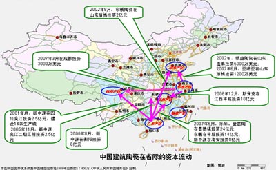 5月份,樂(lè)華、金意陶在景德鎮(zhèn)投資24億元;新中源在高安投資8億元;東鵬在豐城投資14億元。中國(guó)陶瓷行業(yè)跨產(chǎn)區(qū)的資本流動(dòng)(配地圖1)從來(lái)沒(méi)有像今年這么頻繁,這么猛,始于2001年新中源在四川夾江投資的產(chǎn)業(yè)轉(zhuǎn)移到如今掀起高潮。