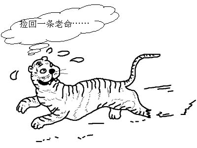 有一次,一只倒霉的老虎出來覓食,一不小心踏上了這個捕獸工具,老虎怎么也掙不脫。老虎知道被獵人捉住就會身首異處,怎么辦?難道為了這幾寸的小小的足掌讓這長達(dá)七尺的身軀受難?不行,還是逃命要緊。老虎發(fā)起怒來,拼命地蹦跳騰躍,掙斷了鉗住的足掌,終于逃跑了。