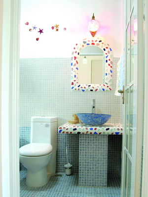 ●空間亮點(diǎn):不忘繽紛琉璃。主衛(wèi)里的鏡框、洗手臺(tái)面和浴缸臺(tái)面是非常具有愛琴海風(fēng)格的細(xì)節(jié)。看到那晶瑩的水晶就有涼涼的感覺。這樣的效果對(duì)施工要求很高:首先要用白水泥鋪一層,然后把玻璃馬賽克鑲嵌在上面,再用填縫劑抹平表面。