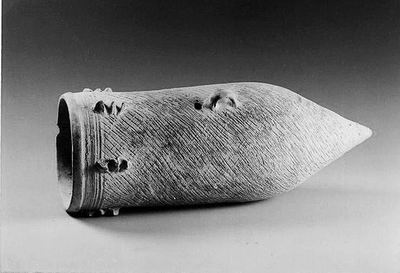 在我們發(fā)現(xiàn)這個尖底紅陶瓶時,里面有幼小的人類尸骨。這件器物除實(shí)用外,口沿處蓋一鼎或盆可做葬具,這就是當(dāng)時流行的甕棺葬。據(jù)說,夭折的嬰孩放在此瓶中,埋在父母住處的房基下,寓意骨肉不分離,瓶身上的圓孔用來供靈魂自由出入。