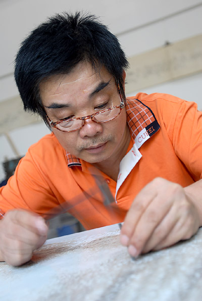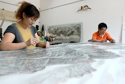 孫兆寶,山東省工藝美術(shù)大師,我市著名的刻瓷藝術(shù)家,1980年起從事刻瓷藝術(shù)創(chuàng)作。去年冬天,他設(shè)想要做一件世界上最大的刻瓷作品,他的這一想法得到淄博中國陶瓷館的大力支持,經(jīng)過短暫協(xié)商便開始實(shí)施。黃河、泰山,是他的首選題材。寒冬臘月,他便來到黃河壺口和泰山之巔,頂著凜冽的寒風(fēng)去感受黃河的厚重與力量、泰山的雄壯與威嚴(yán)。從此他便全身心地投入到創(chuàng)作中去。面對長2.6米,寬1.2米的巨大瓷板一時無從下手,他沒白沒黑地研究揣摩大型瓷板的刻制方法,經(jīng)過半年的時間,逐步形成了他自己獨(dú)特的刻瓷藝術(shù)語言。