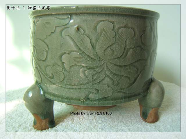 北宋王朝高度的審美觀,使汝瓷器物的制坯工藝要求獨(dú)特,就汝官瓷三足洗而論,口面、直徑、公分、高、公分下三足承之給人以典雅之感,而被很多人所忘掉的卻是外面上下各有一道弦紋,此物內(nèi)上沿有一毫米,下連續(xù)有三道淺溝,那么這些弦紋和淺溝干什么用呢?