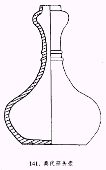 蒜頭壺 始見于秦漢時期的一種壺式,有陶質(zhì)和原始青瓷兩種。特征為蒜頭形小口長頸,圓腹。東漢時期蒜頭壺腹部比西漢時期豐滿,蒜頭呈扁圓形。有的蒜頭壺頸、肩部堆塑有人物、龍、虎等紋飾。