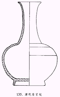 傳瓶 流行于隋唐時(shí)期的器形,即單口,雙腹并聯(lián)的雙縭尊,自銘"傳瓶".目前僅發(fā)現(xiàn)兩件,分別收藏于天津市藝術(shù)博物館和中國(guó)歷史博物館,后者出土于西安郊區(qū)隋大業(yè)四年(608年)李靜訓(xùn)墓.