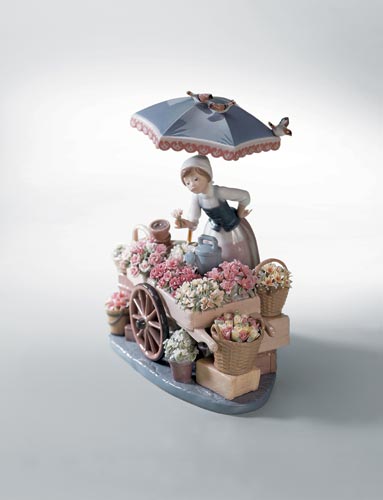 這件作品創(chuàng)作于1983年,是雅致相當(dāng)經(jīng)典的一件作品。一位小女孩在滿是花朵的花車旁留連忘返,花車頂上還停著幾只小鳥,一派春機(jī)盎然的景象。這件作品極盡地表現(xiàn)了雅致經(jīng)典的花朵制藝,每一個(gè)花籃中都盛放著不同的花朵,形態(tài)、顏色各異,甚至連每個(gè)花籃也各不相同,各種材質(zhì)在陶瓷的雕琢下逼真展現(xiàn)。
