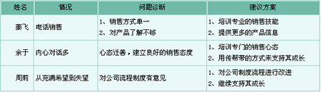 專家列出了一張表,分別是針對銷售部門姜飛、余于、周莉在心理劇中暴露的情緒癥結(jié)與問題診斷及初步的建議方案: