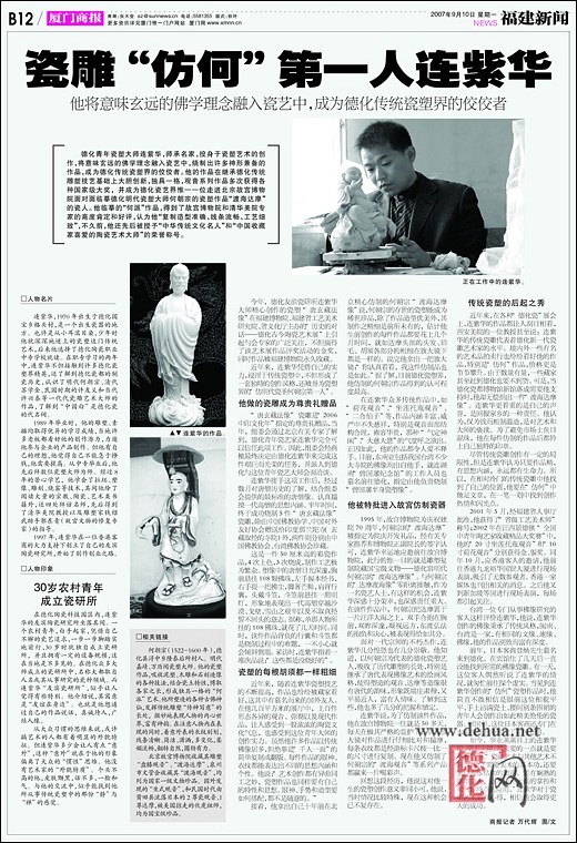 前年,日本客商登納先生慕名來到德化。在賓館住了幾天后一直沒能找到所需的佛像瓷雕。有一天,這位客人偶然聽說了連紫華的情況,就匆忙前往探個虛實。當見到連紫華創(chuàng)作的“仿何”瓷塑作品時,他簡直不敢相信是眼前這位相貌平平、手上沾滿瓷土、腰間別條圍裙的青年人會創(chuàng)作出如此精美絕倫的瓷器;貒螅@位日本客商還專門在本國報紙上為他作了宣傳介紹。