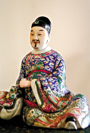 佛山市民冼先生收藏著一件輕易不示人的“鎮(zhèn)宅之寶”:不怒而威的劍眉、狹長的星目、高挺的鼻梁……神態(tài)安詳?shù)奶铺谏泶┣嗌埮,手握酒杯盤腿斜倚在龍榻上面。