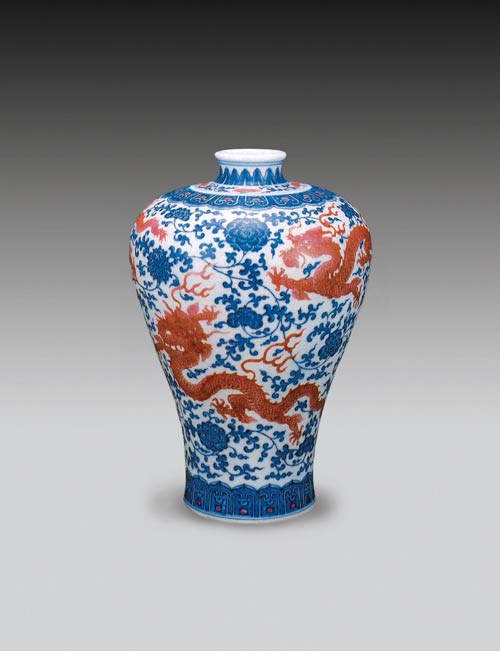 云龍紋或海水龍紋,是最常見、價(jià)值最高的青花釉里紅圖案,它以青花繪出云朵和翻騰的海水,以銅紅繪出飛舞的巨龍,真真是相得益彰。在雍正朝,青花和釉里紅這兩種釉下彩結(jié)合得非常完美,不僅吸收了明代永樂、宣德時(shí)期云龍紋與海水龍紋各自的題材,最終創(chuàng)造出海水云龍紋圖樣。這種紋樣超越了明代圖案化取向?qū)⑵魑锛y飾提升至繪畫的高度。它以青花表現(xiàn)瓶底部的海水及器物腹部的云氣,色調(diào)或濃或淡,都非常鮮亮;釉里紅以淡繪的呈色技法表現(xiàn)出紅龍翻滾于怒濤洶涌的大海上,形象極為生動(dòng)。青花發(fā)色還時(shí)有暈散,這都是仿明宣德青花的色調(diào)。耿寶昌先生認(rèn)為,這種青花色澤中含有類似宣德青花的褐色斑,它是人為重筆點(diǎn)染而成,飄浮于釉面中的。