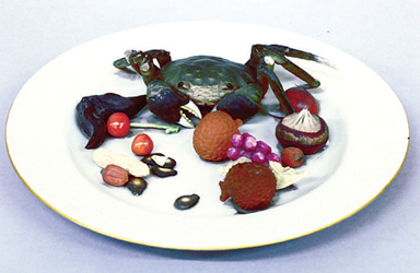 乾隆一朝是清代社會發(fā)展的鼎盛時期。此時,以景德鎮(zhèn)官窯為代表的制瓷業(yè),不僅精于仿制歷代名瓷,而且在繼承和發(fā)揚前代瓷器藝術(shù)的基礎(chǔ)上創(chuàng)新出眾多新奇的品種,把清代制瓷業(yè)推向創(chuàng)造性的階段。“象生瓷”即是當(dāng)時的新作,它以瓷塑的方式摹仿自然界的花果或水生小動物的形象,如:核桃、棗、栗子、花生、瓜子、蓮子、荔枝、櫻桃、橘子、荸薺、石榴、菱角和河蚌、蝦、海螺、螃蟹等。這些瓷塑造型準(zhǔn)確,大小與原物相當(dāng),所施彩釉細(xì)膩逼真,給人以宛如真物再現(xiàn)的新奇精巧的藝術(shù)享受。此類象生瓷塑除少數(shù)單獨成器外,一般多黏結(jié)于圓盤或高足盤上,供宮內(nèi)御用陳設(shè)和玩賞。