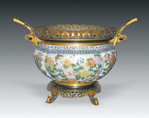 根據(jù)胎地的不同,琺瑯器一般可以分為金胎琺瑯、銅胎琺瑯、瓷胎琺瑯、玻璃胎琺瑯、紫砂胎琺瑯等,而最為常見(jiàn)的是金屬胎琺瑯器。其中銅胎琺瑯因?yàn)殂~料與表面琺瑯容易結(jié)合,且銅料價(jià)格相對(duì)容易接受,因此銅胎琺瑯最為廣泛。金屬胎琺瑯器依據(jù)具體加工工藝的不同,又可分為掐絲琺瑯器、鏨胎琺瑯器、畫琺瑯器和透明琺瑯器等幾個(gè)品種。掐絲琺瑯器在國(guó)內(nèi)出現(xiàn)比較早,歷史記載可追溯到宋元時(shí)期,在明景泰和成化兩朝最為常見(jiàn),即是俗稱的“景泰藍(lán)”。