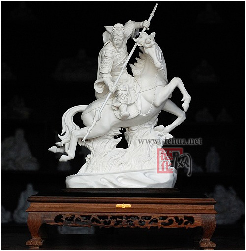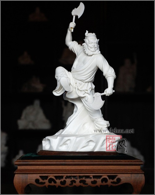 “身披銀鎧軟甲,丈八蛇矛緊挺,霜花駿馬頻嘶……”,甩動(dòng)四蹄,奔跑中的戰(zhàn)馬,飛揚(yáng)的馬蹄似乎還帶來(lái)一陣撕殺聲——這就是我們?cè)谇耠p炯大師的陶瓷雕塑研究所看到的《水滸傳》108將之一林沖的陶瓷雕像。從表情姿態(tài)到衣褶,細(xì)至環(huán)環(huán)相扣的韁繩,以何朝宗為代表的一代宗師們創(chuàng)立的德化民間傳統(tǒng)陶瓷雕塑藝術(shù)形式和塑造技法,把好一個(gè)梁山好漢林沖的英姿塑造得威武生動(dòng)、展示得淋漓盡致。