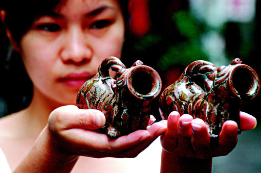 在唐山西街古玩城,記者見到了這雙“虎子”酒樽現(xiàn)在的主人趙緯芳,酒樽是他剛從臺灣收藏愛好者的手上買回來的。趙緯芳收藏的這兩只“虎子”出自宋代的長沙窯,“虎子”的外形如一只站立的老虎,虎尾巴緊收,大嘴張開,有幾分威嚴之勢。整個“虎子”呈橘紅色,在老虎身上描有虎斑。用收藏愛好者慣用的放大鏡觀看虎斑,色彩斑斕的紋路細膩鮮艷。在老虎身上架著一條繩索狀的“橋梁”,那是酒樽的“提手”。指著老虎張開的大口,趙緯芳說,這是杯口,宋朝人就是從這里倒酒進虎身,再從“虎口”中“奪”酒喝的。細看兩個“虎子”的口,唇印非常的明顯。