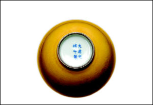 碗內(nèi)壁為白底青花紋飾,底釉為青灰白色,碗口沿及近底處繪兩道青花勾線,碗內(nèi)底繪一圓形青花“福祿壽圖”,繪有蝙蝠、梅花鹿、仙桃、如意頭云和一嬰兒坐于鹿上。清晚期瓷器上常繪此圖,象征福、祿、壽三星高照。這件器物青花發(fā)色青翠艷麗,有深淺濃淡之別,紋飾疏密有致,生動(dòng)古樸,又有龍紋黃色釉,具有晚清官窯器的典型風(fēng)格。