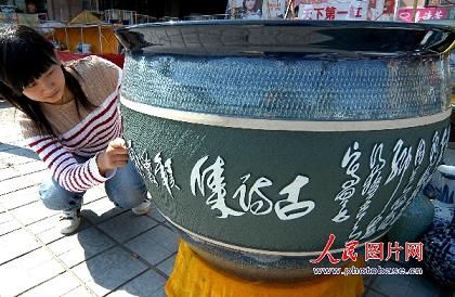 10月8日,一口需要5個(gè)大人才能抬動(dòng),標(biāo)價(jià)36萬元的天下第一缸,在江蘇連云港市新浦隴海步行街對外展示。 據(jù)悉,這口大缸是由江西景德鎮(zhèn)老五瓷廠高級工藝師設(shè)計(jì)燒制,高80公分、直徑95公分,采用多種工藝燒制而成,缸體色澤鮮亮,刻有草書詩詞,讓觀者看后嘖嘖稱絕。